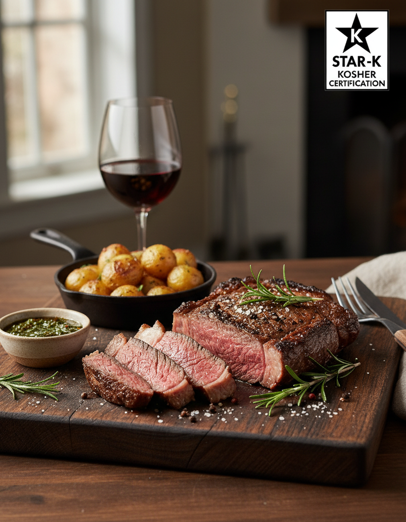 Our Star-K Glatt Kosher Black Angus beef comes from pasture-raised cattle that are grain-finished for superior marbling. Unlike mass-market beef, our cattle are raised without antibiotics or added hormones, and all cuts are USDA-certified High Choice/Prime grade—the top 2% of all beef produced.